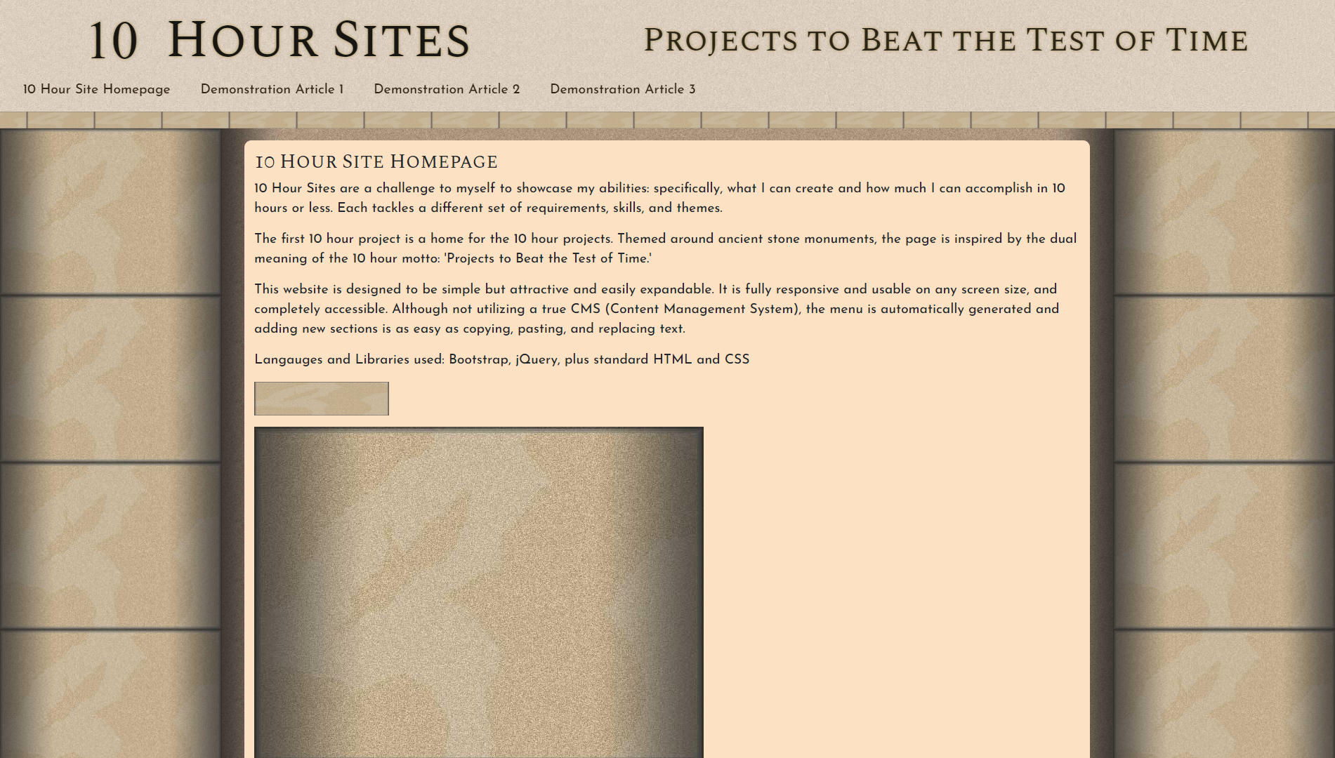 10 Hour Sites are challenges I set for myself to hone my skills, explore new techniques, and highlight my abilities. Each one has a specific goal, which must be completed in 10 hours or less. The various 10 Hour Sites are displayed on their own dedicated page, which is itself the first 10 Hour Site.